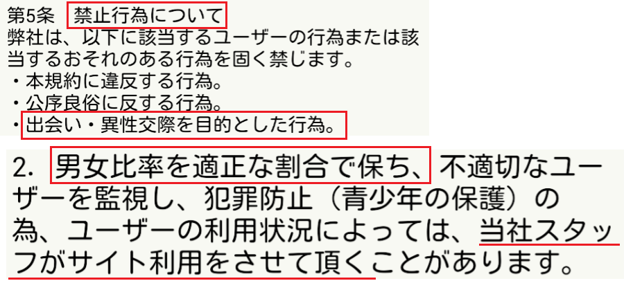 出会いを禁止して、男女比率を適正な割合で保つ為に当社スタッフがサイトを利用させて頂くと書いてある。