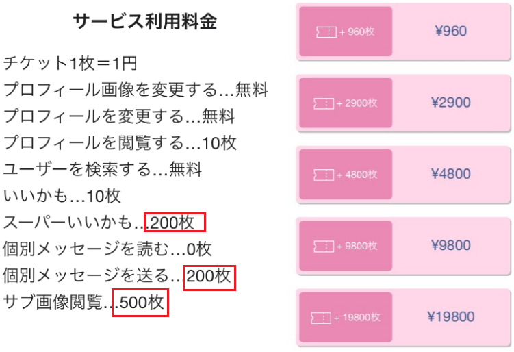高すぎでしょ!メッセージ送るのに200円、わけのわからないスーパーいいかもに200円。そして画像を1枚見るのに500円って詐欺意外なにものでもない!この高額の料金体系が確認できた時点で超悪質出会い系アプリ確定だと言ってもよい!