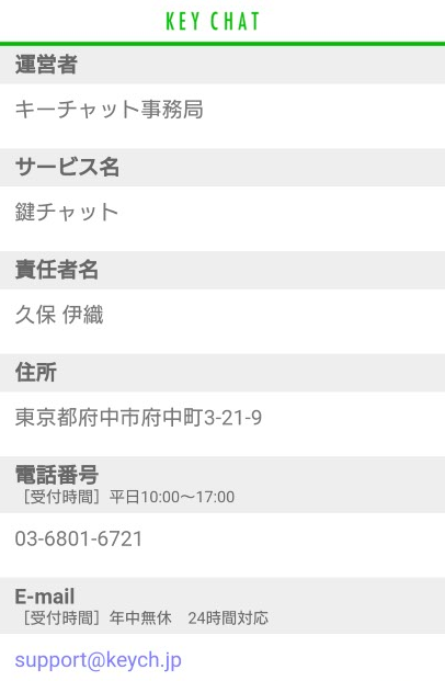 運営者がキーチャット運営事務局で、サービス名が鍵チャットとかふざけているし会社名でも何でもない。