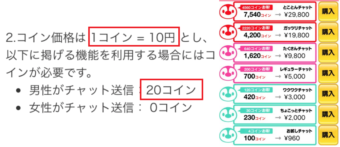 1コインは10円でチャット1通送信に20コイン(200円)がかかる!