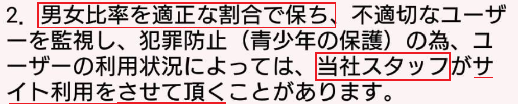 利用規約の一番下に男女比率を保つ為に当社スタッフが利用すると書いてあります。