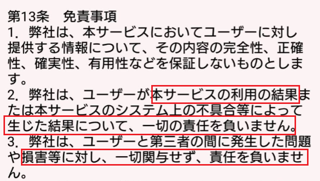 サービスの利用の結果や発生した損害について一切の責任を負わないと書いてある!